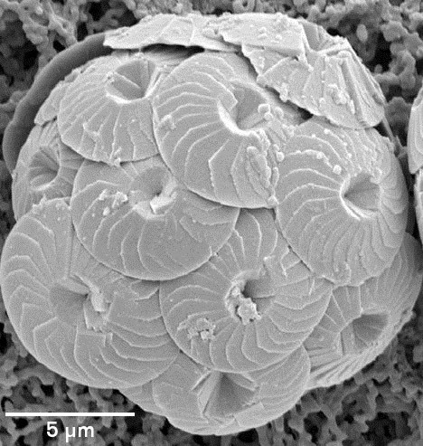 One of the victims of these extra hydrogen ions is a type of phytoplankton called coccolithophores, one of the most abundant single-celled algae in the ocean. They are found in the upper, sunlit layers of the sea and play a vital ecological role. Coccolithophores produce a large proportion of the planet's oxygen, sequester huge quantities of carbon and provide the primary food source for many of the ocean's animals. Coccolithophores use calcite to form tiny plates, or scales, on their exterior. Lower pH, and a drop in the carbonate saturation state, and dissolution of calcium carbonate could therefore have a harmful effect on the abundance of coccolithophores and, consequently, on the health of the oceans and the planet.