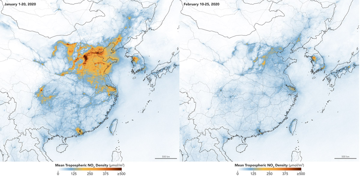 The novel coronavirus which causes the COVID-19 illness was first identified in Wuhan, China in December 2019. By January 2020, Chinese authorities had shut down local businesses and implemented transport restrictions. Satellites monitoring pollution for NASA and the European Space Agency have since detected a marked decrease in airborne NO2 after the shutdowns.