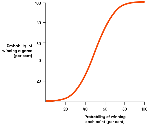 The graph shows that if the probability of winning a point differs from 0.5 (or 50 per cent) by just a little bit, the probability of winning a game changes by a lot. If the probability of a player winning each point moves up to 60 per cent, the probability of winning each game jumps up to over 73 per cent. A 70 per cent chance of winning each point translates into a 90 per cent chance of winning each game.
