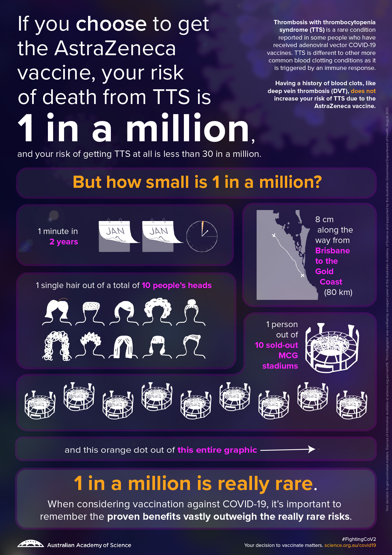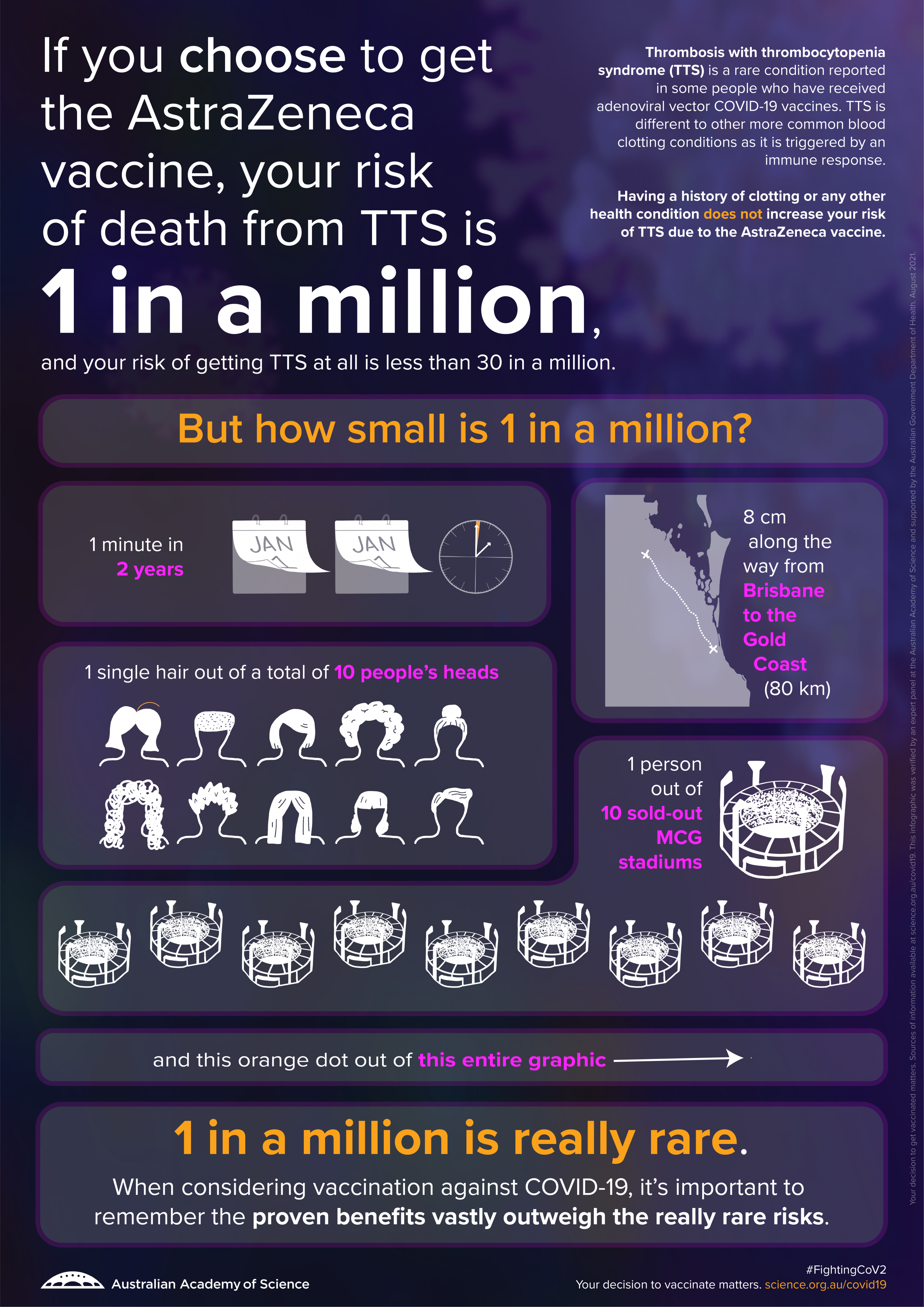 Infographic 1: If you choose to get the AstraZeneca vaccine, your risk of death from TTS is 1 in a million and your risk of getting TTS at all is less than 30 in a million