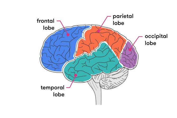 Each cerebral hemisphere is divided up into four regions called ‘lobes’: the frontal lobe, parietal lobe, occipital lobe and temporal lobe.