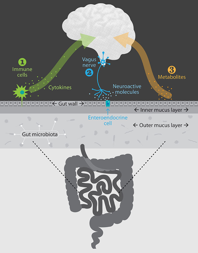 2. Microbes also interact with gut cells called enteroendocrine cells that produce neuroactive molecules. These molecules interact with the vagus nerve, which sends signals to the brain.