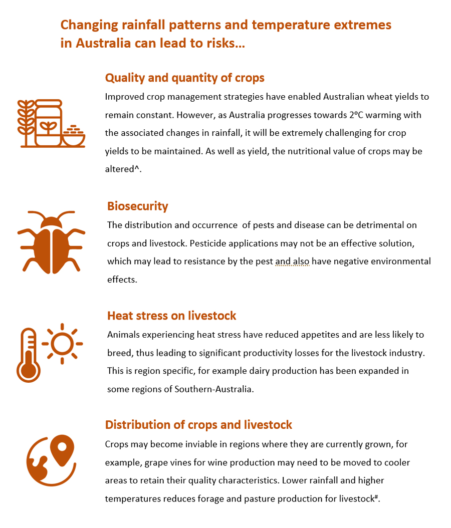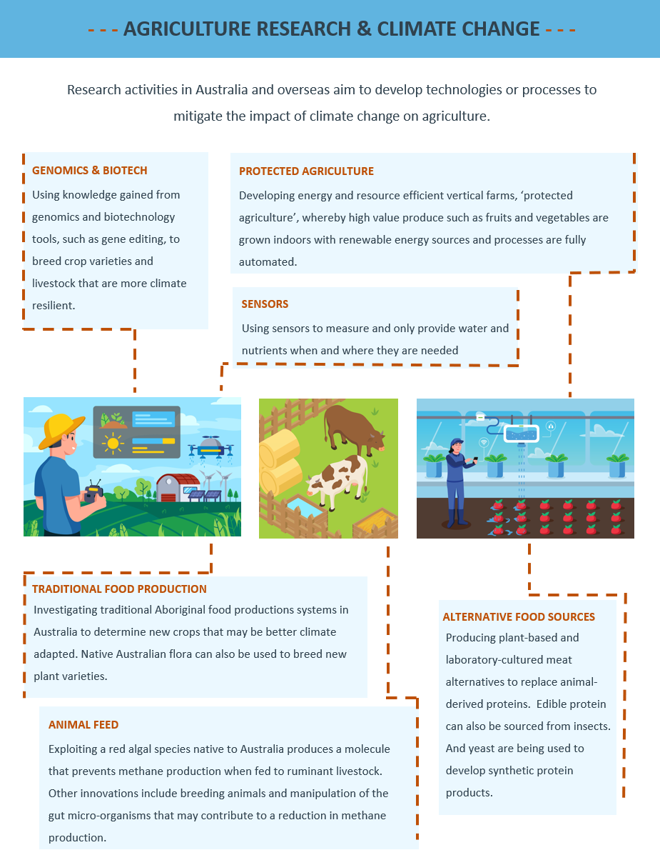 - Innovative research and development of new technologies is underway in Australia and internationally to lessen the impact of climate change on agriculture, and reduce agriculture’s impact on the climate.