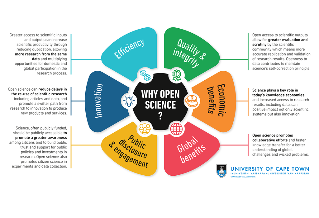 There are many benefits to the open science model. See larger version. See accessible text version (PDF). Image adapted from: Gaelen Pinnock, University of Cape Town.