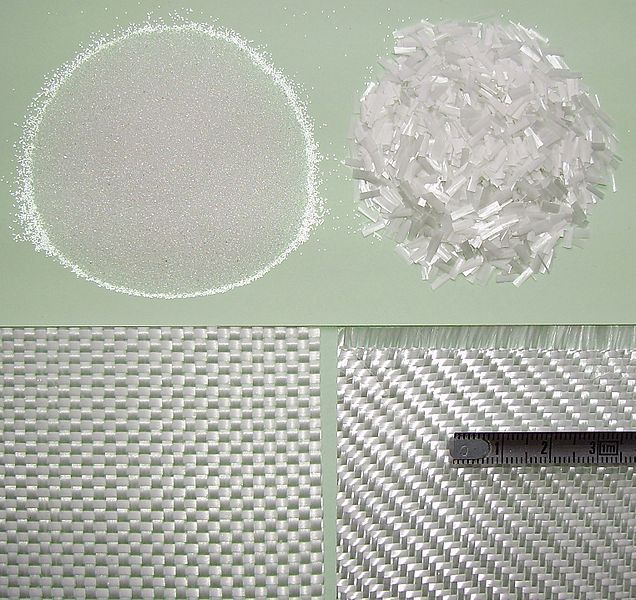 Examples of various forms of glass reinforcements to be used in the creation of fibreglass. Image source: Cjp24 / Wikimedia Commons.