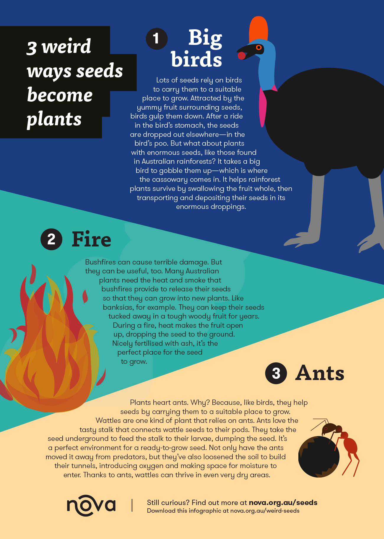Lots of seeds rely on birds to carry them to a suitable place to grow. Attracted by the yummy fruit surrounding seeds, birds gulp them down. After a ride in the bird’s stomach, the seeds are dropped out elsewhere—in the bird’s poo. But what about plants with enormous seeds, like those found in Australian rainforests? It takes a big bird to gobble them up—which is where the cassowary comes in. It helps rainforest plants survive by swallowing the fruit whole, then transporting and depositing their seeds in its enormous droppings.